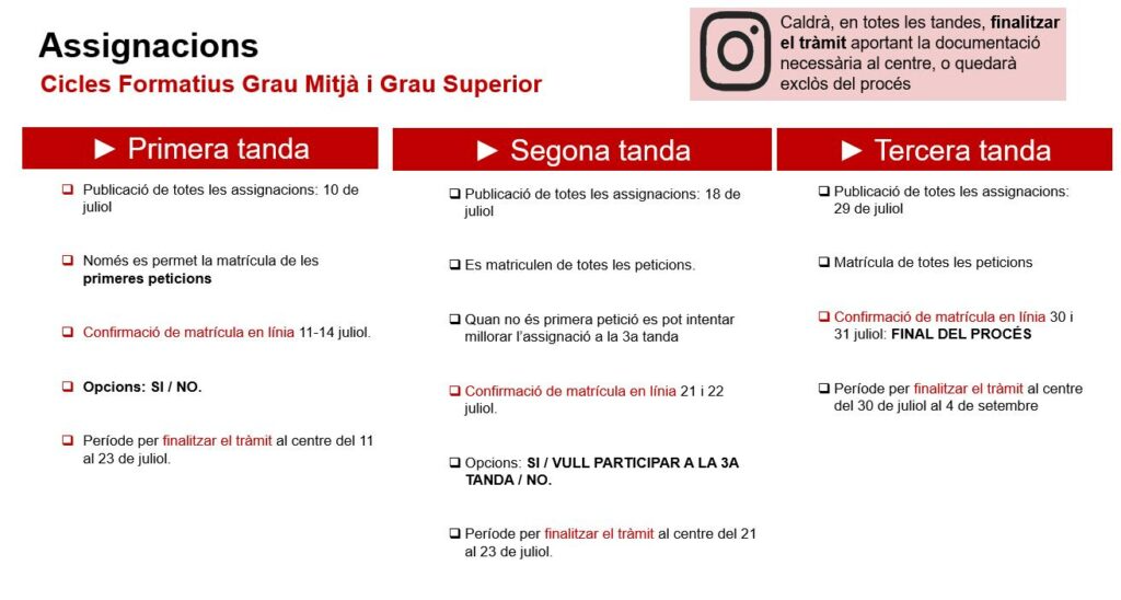 L’assignació de places es farà en 3 tandes. L’alumnat haurà de realitzar dues accions bàsiques: confirmar en línia l’assignació o renunciar-hi voluntàriament, i completar els tràmits amb el centre.