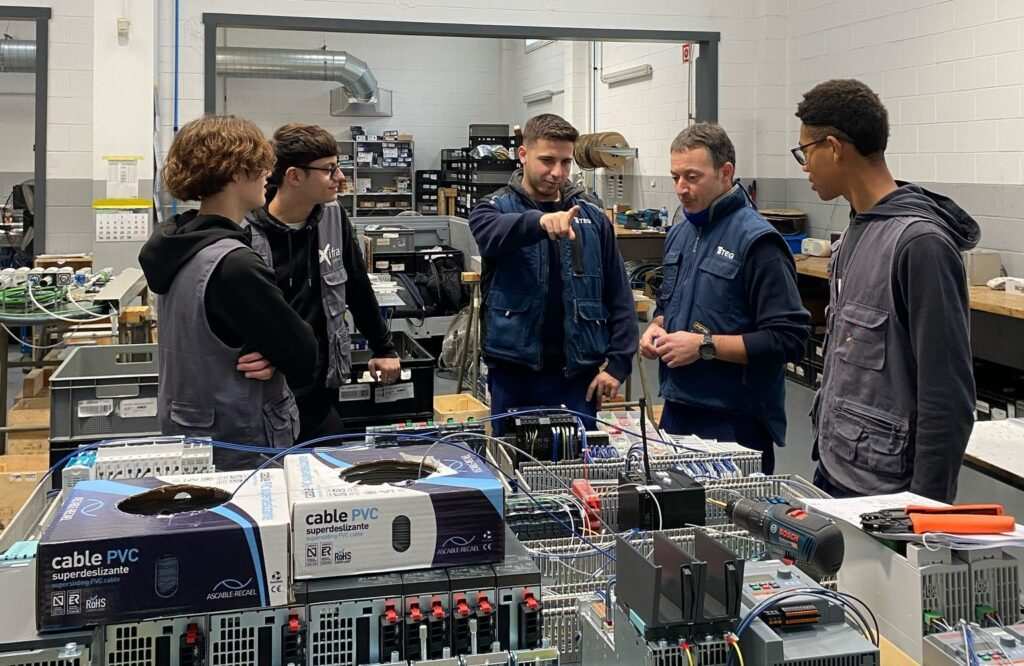 Fotografia de portada: Alumnat del Grau Mitjà d'Instal·lacions Elèctriques i Automàtiques de l'institut Narcís Xifra visitant una empresa del sector. | Foto: Institut Narcís Xifra.