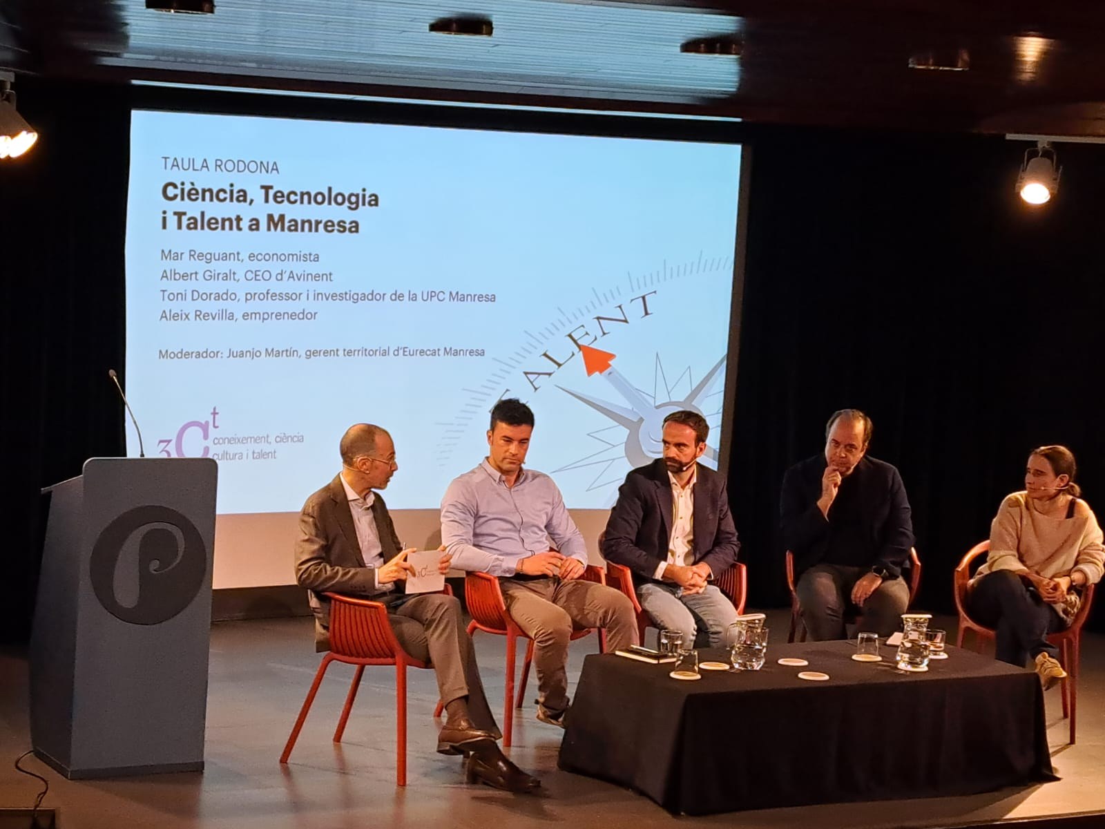 Aquestes reflexions es van completar amb dues taules rodones. A la dedicada al talent científic i tecnològic, moderada pel gerent territorial d’Eurecat Manresa, van participar-hi Albert Giralt Cadevall, CEO d’Avinent, Toni Dorado Castaño, investigador i professor de la UPC Manresa i Aleix Revilla Sala, emprenedor, a més de Mar Reguant Ridó. Van definir el talent com a persones espavilades, que tenen capacitats i estan disposades a fer-les servir perquè passin coses al seu entorn. Van estar d’acord que Manresa i el seu entorn compta amb molt de talent. La clau per retenir-lo “és oferir-li oportunitats per executar el que pot i vol fer” i també espais de trobada intel·lectualment atractius.