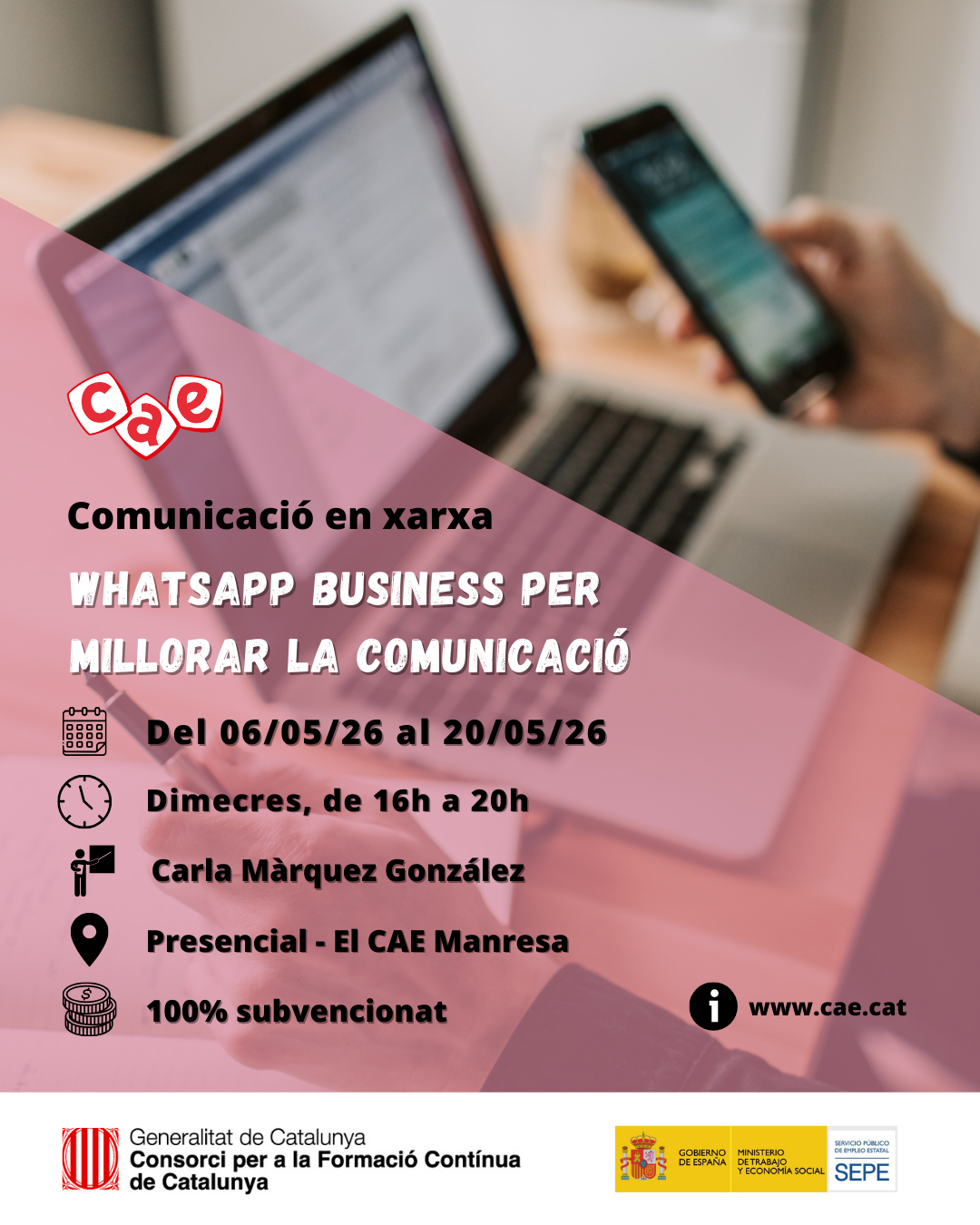 Aquest curs t’ofereix les claus per utilitzar WhatsApp Business com una eina efectiva de comunicació i atenció al client o soci. Aprendràs a configurar-lo correctament, a estructurar missatges útils, a automatitzar respostes i a integrar-lo dins l’estratègia digital del teu negoci. Una formació pensada per millorar la relació amb els clients i usuaris, optimitzar el temps i projectar una imatge professional o organitzativa, clara i coherent.