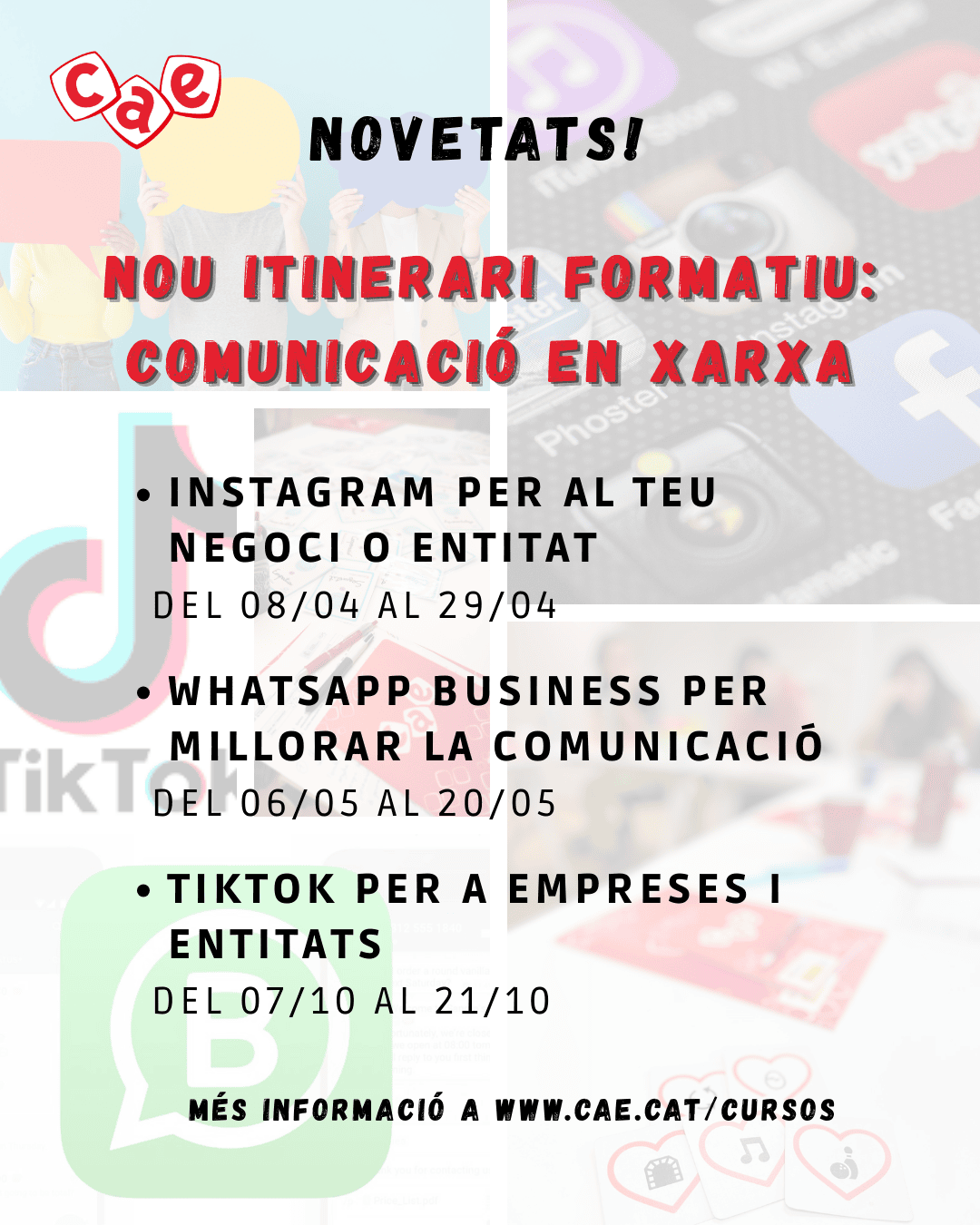 El CAE ha ampliat la seva oferta formativa amb un itinerari especialitzat en comunicació digital pensat per a persones, entitats i professionals que volen millorar la seva presència i estratègia en entorns digitals. La proposta inclou diversos cursos pràctics centrats en eines i plataformes que actualment tenen un paper clau en la difusió de continguts i en la gestió de comunitats.